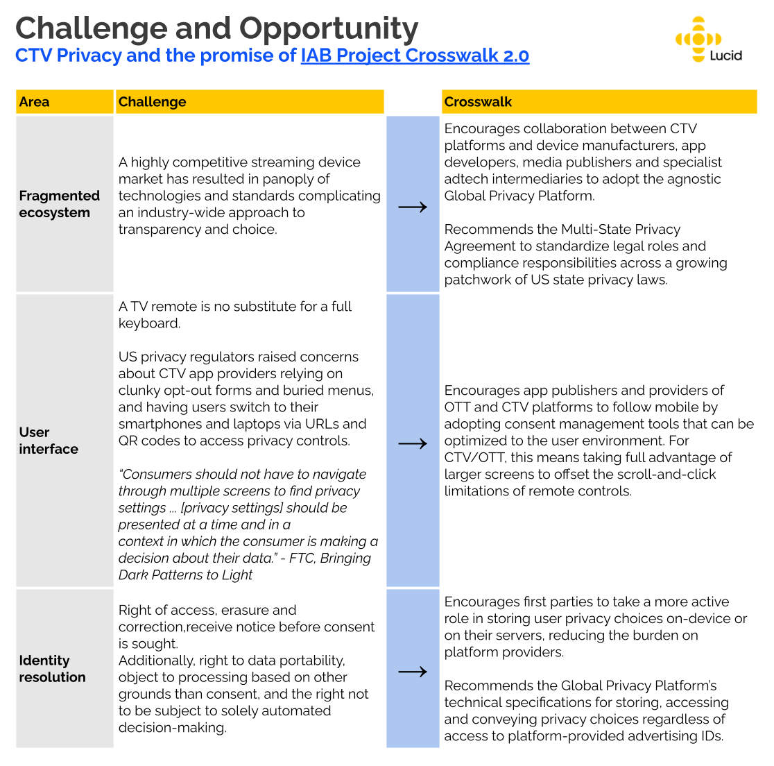 Yet, CTV’s rapid growth in programmatic advertising brings complex challenges, in privacy and advertising-compliance. Where an ecosystem is challenged to agree on common policies and standards, viewer data practices and privacy experiences become fragmented, too.