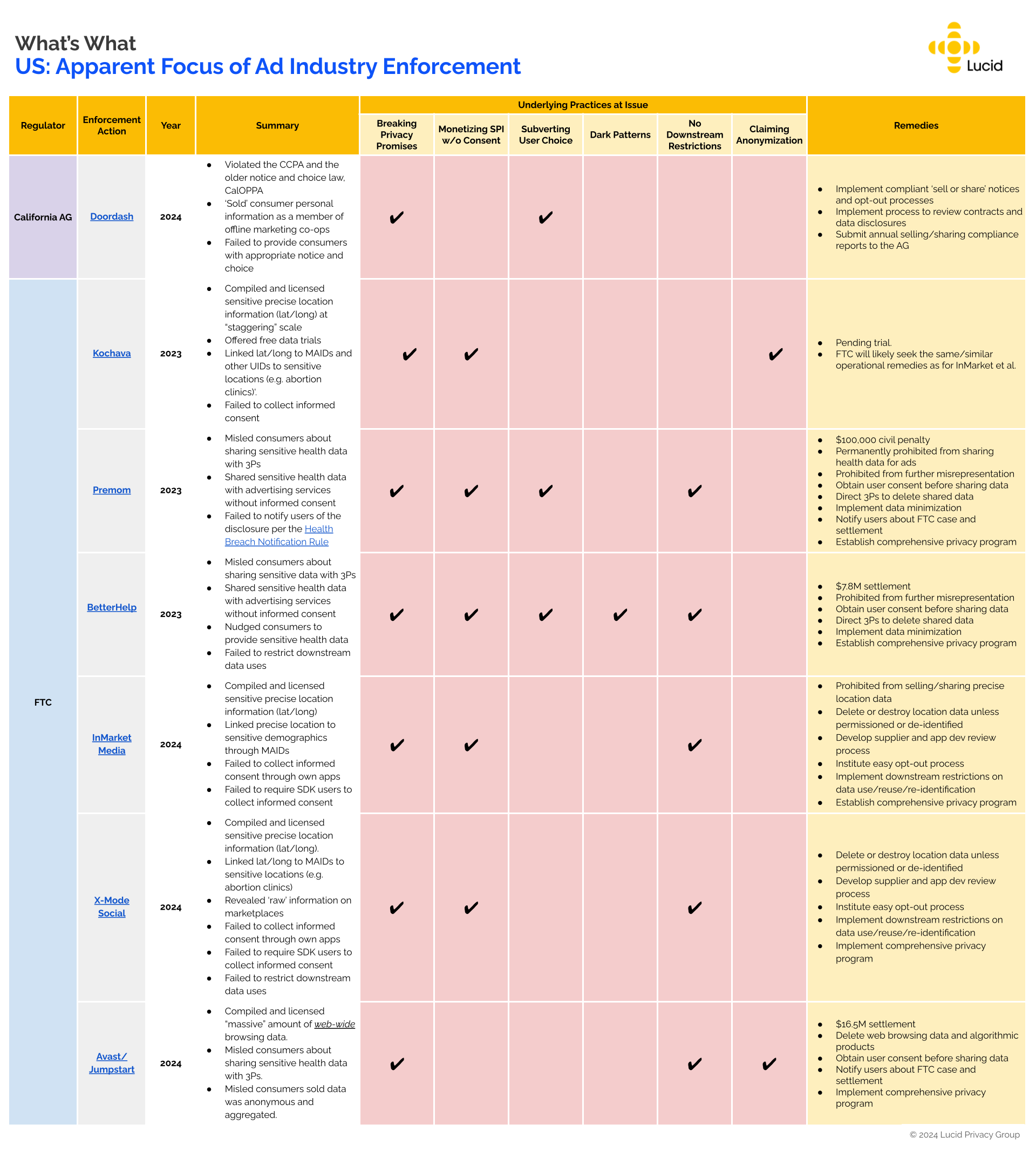 Over the last few years, the regulators have announced enforcement action in eight Adtech related cases. In some of these, the case was not targeting an Adtech company directly, but implicated ad technology that the target was using, often to market their own products and services. Each of these undertakings warrant their own fulsome legal analysis, but we’ll address them each in turn here with an eye on the big picture.