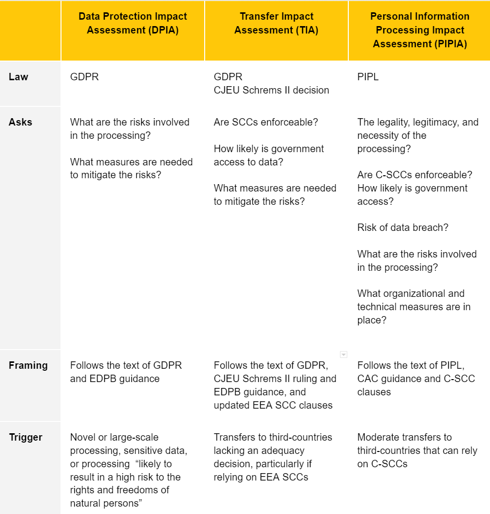 Like under the GDPR and EDPB guidance, the PIPIA’s overarching concern is whether the importer can comply with C-SCCs. Unlike a TIA, which largely concerns the likelihood of a government requesting or forcing access to imported data, the PIPIA seems to ask why data should be transferred at all. We can speculate CAC is being more cautious (and protectionist) in its formulations, not only because C-SCCs are yet untried and untested, but possibly also in deference to China’s data localization requirements.