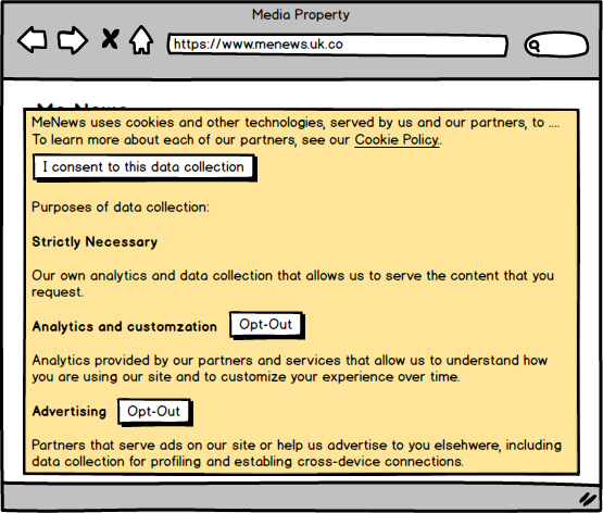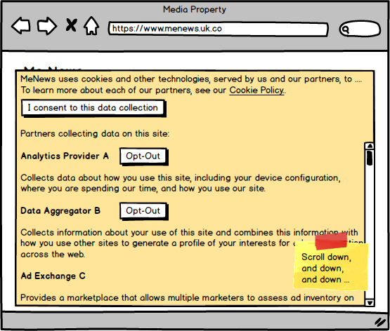 A publisher could make the list smaller if they were to identify the data collectors on each page, and present additional consent barriers on an incremental basis as new trackers emerged, or perhaps do away with barriers and implement a more pleasing customer service bubble or tab presentation. The ICO even recommends this as an acceptable approach (just in time consents). But user friendly bubbles don’t suit an explicit consent requirement where the user absolutely must engage with the interface before proceeding. And leaving aside the technical complexities (its achievable, but not without significant additional investments) the practical impact of this would be to present additional consent interfaces continuously as the user browses from page to page. And the initial consent dialogue would likely still require multiple viewports of scrolling to get through. The consumer experience would undoubtedly be inferior and disclosures would not be noticeably simplified.