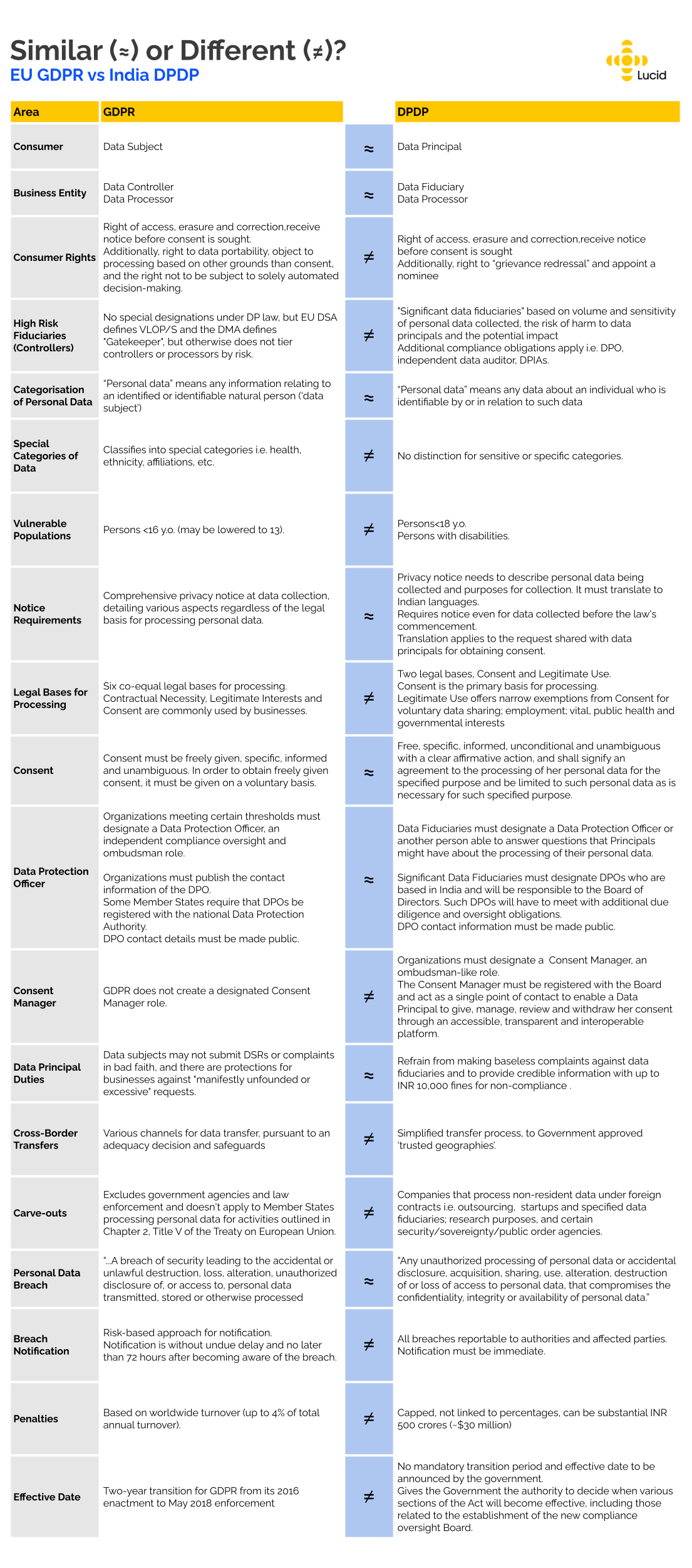 As we await confirmation of the act's effective date and for Indian authorities to work through how the law should work in practice, we thought it helpful to further compare the DPDP to the GDPR, below.