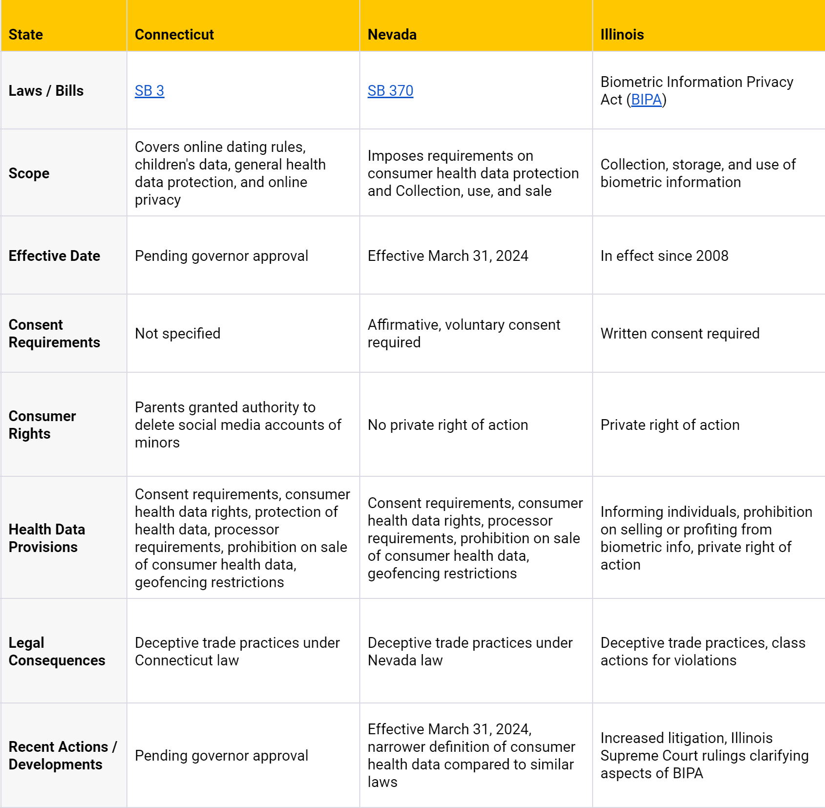 In 2023, the privacy race has expanded to include healthcare data, with states like Washington, Connecticut, and Nevada introducing data-specific bills to protect consumers of wellness services beyond the traditional confines of America’s healthcare system. This is in parallel to states like Illinois’ interest in biometric data privacy, with IL’s BIPA being the most consequential to-date.